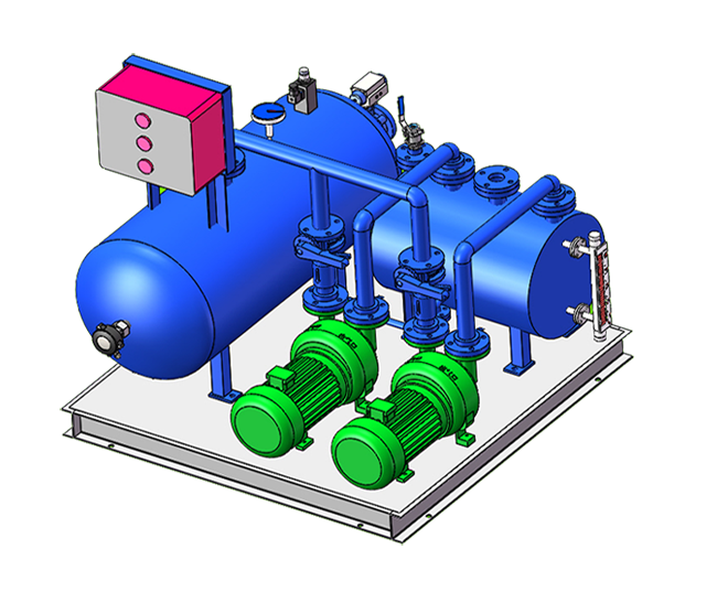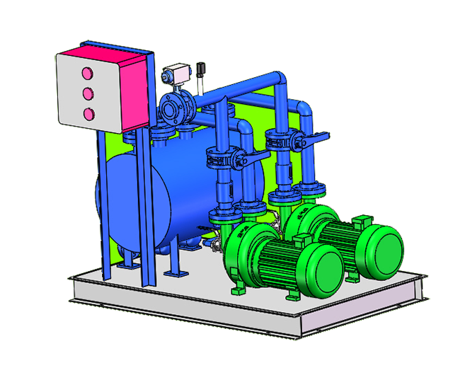 由真空泵、氣水分離器、前置罐、連接部件、底座控制元件等零部件組成,機組帶E型配置控制柜,機組根據安裝在前置罐上的液位計的液位信號來判別引水是否成功,引水成功后,機組自動關閉進氣管路上的閥門和切斷引水裝置電源,控制柜輸出引水成功信號。